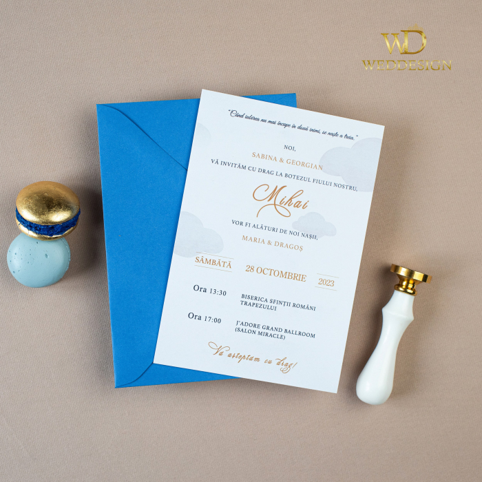 Pretul invitatiei se actualizeaza odata cu alegerea fiecarui element al acesteia. Tiparirea si asamblarea sunt incluse in pret.