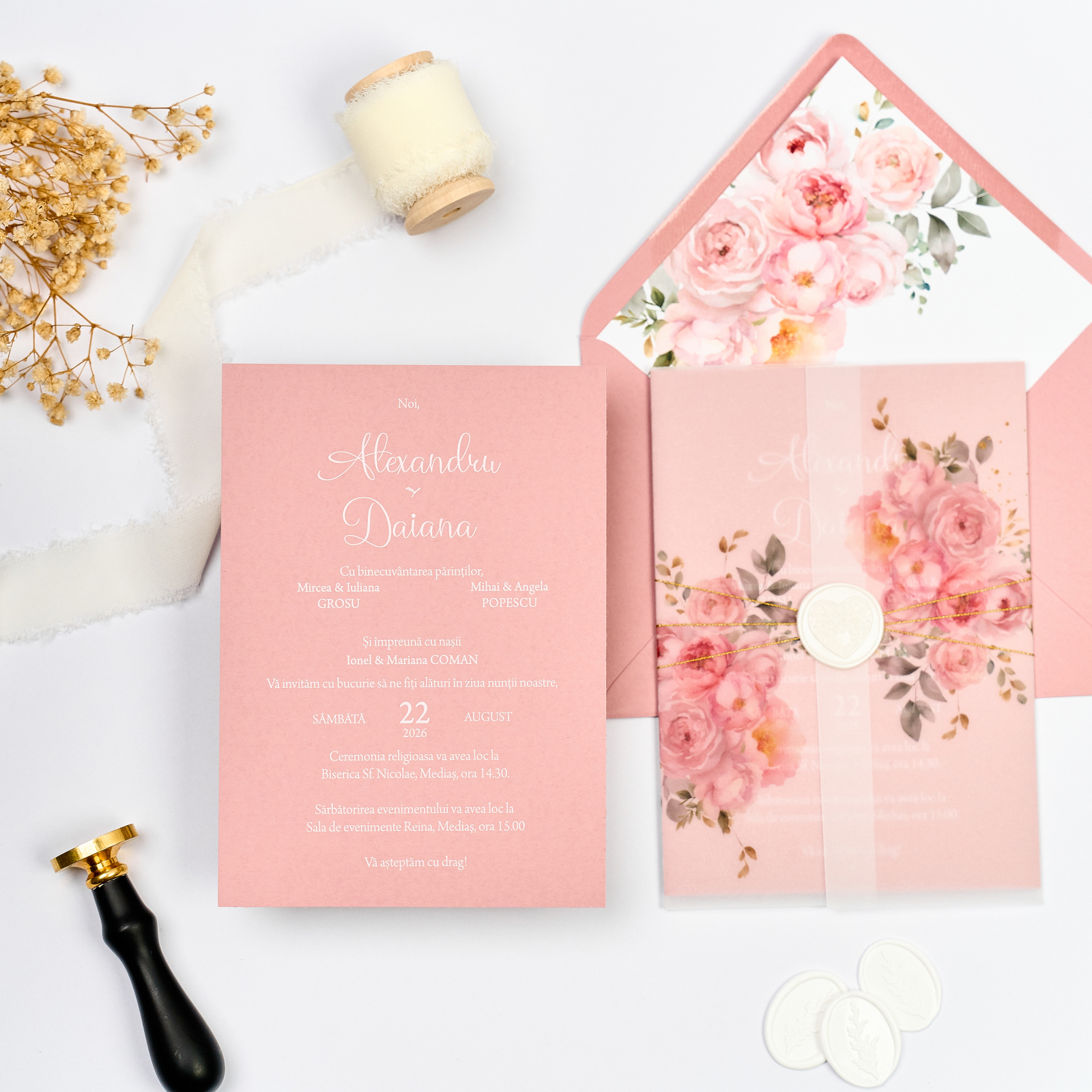 Invitatie de nunta printata cu toner alb pe carton roz texturat, invelita in calc printat cu plic si interior printat, o expresie a elegantei si romantismului