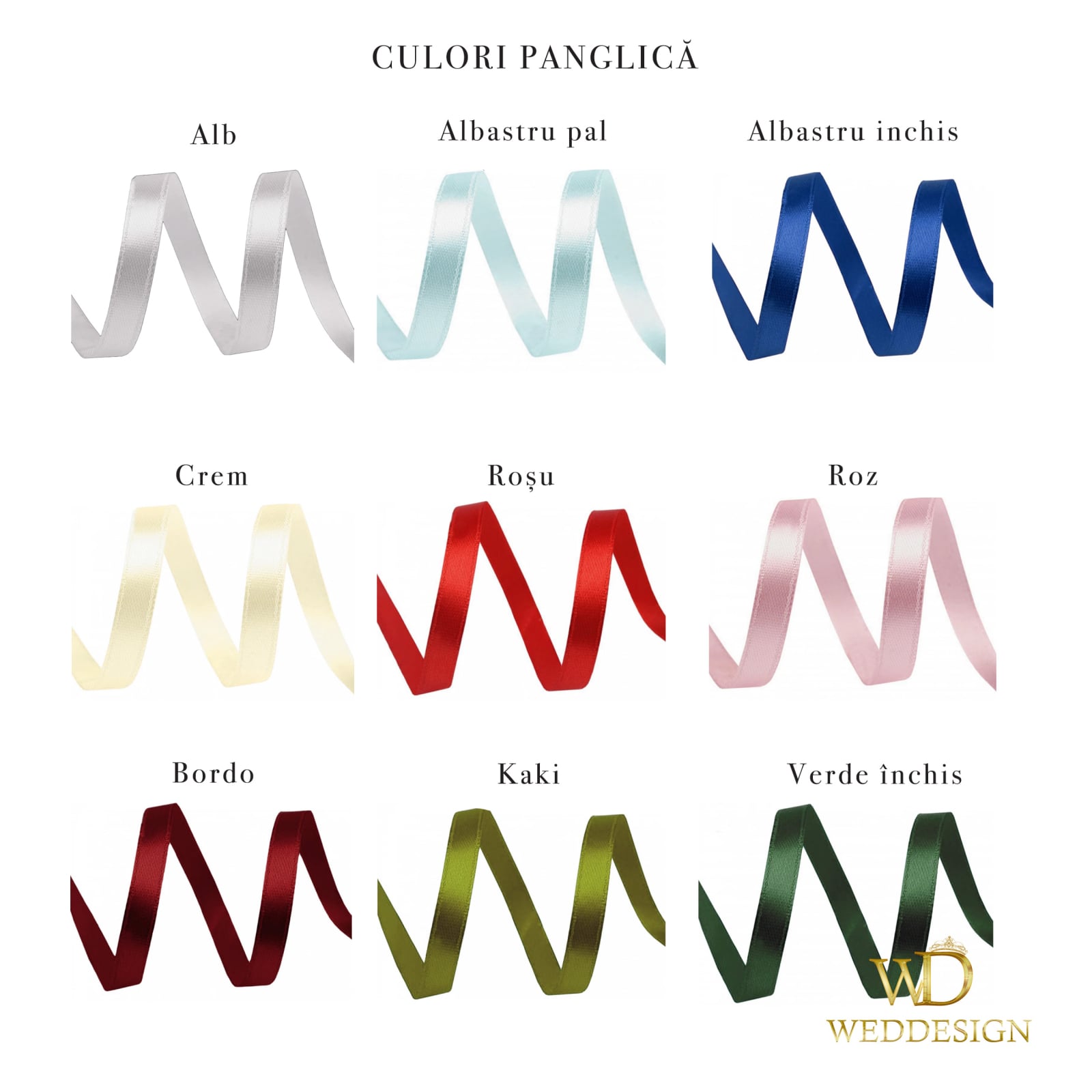Etichetele sunt realizate din carton alb, de 300g si vin insotite de panglica de saten (aproximativ 30 cm pt o eticheta)