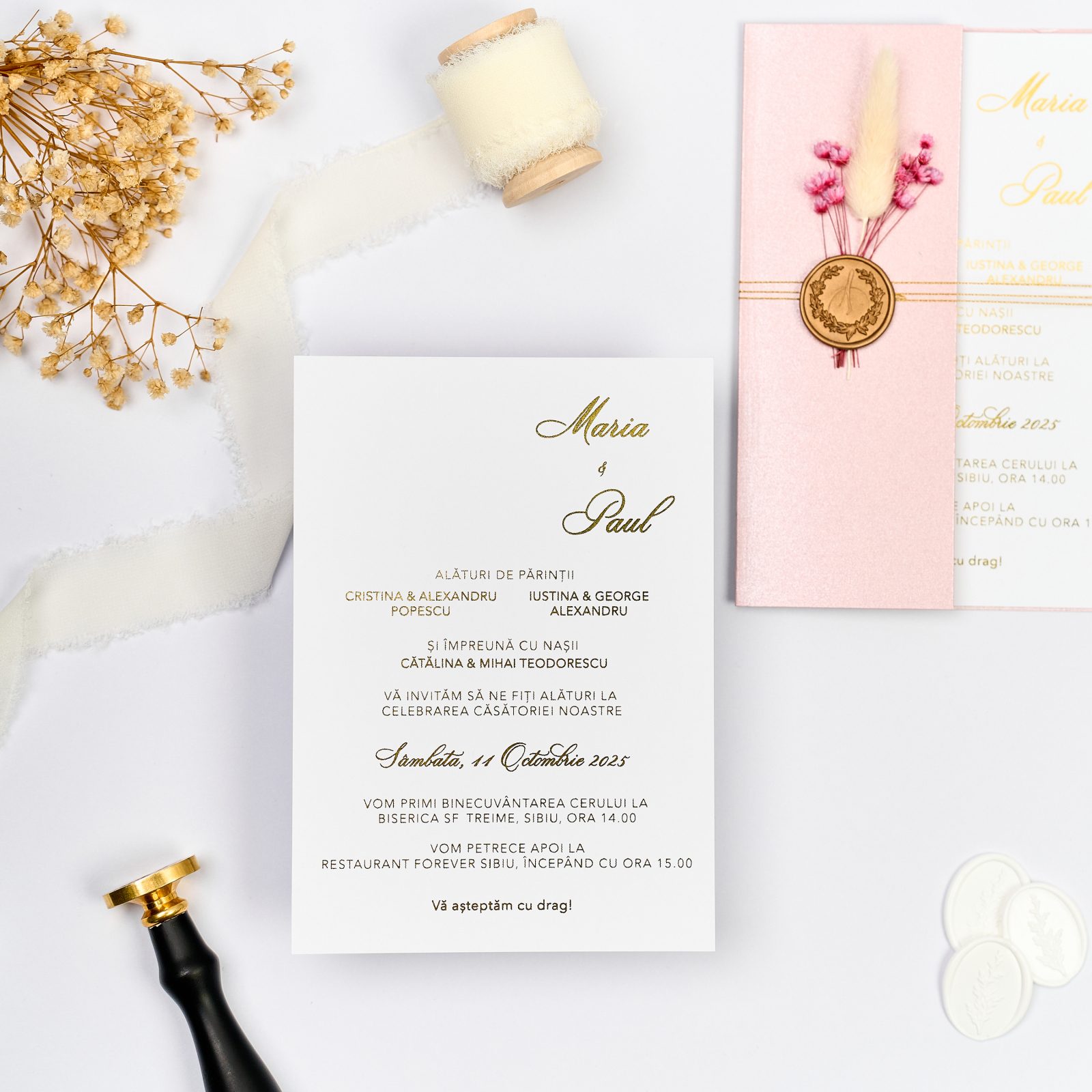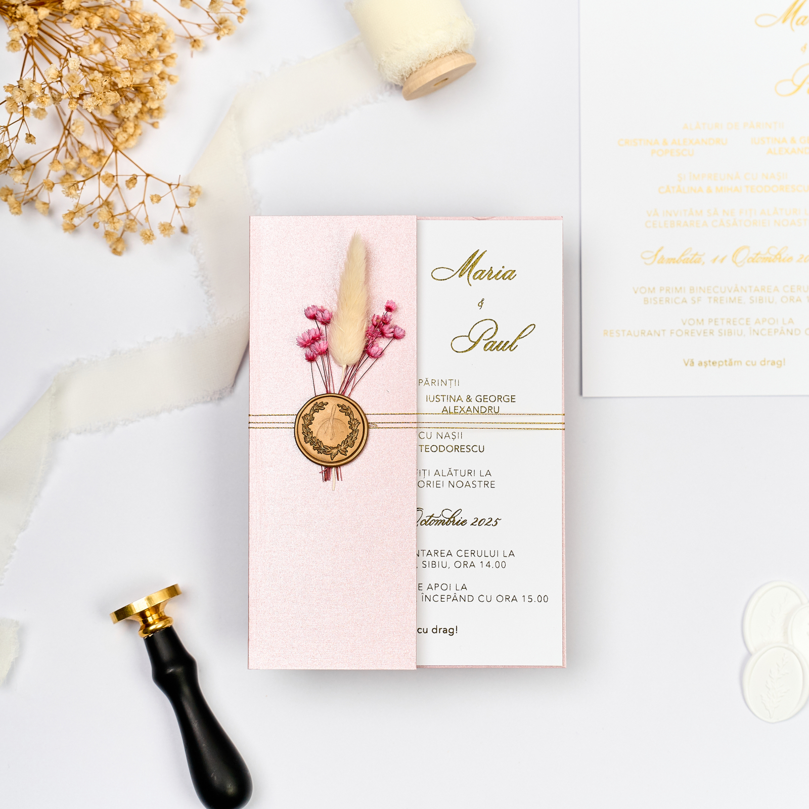 Invitatie de nunta Pink folio, o invitatie speciala cu scris auriu metalizat pe carton neted, imbracata in suport roz sidefat si accesorizata cu sigiliu cu flori uscate