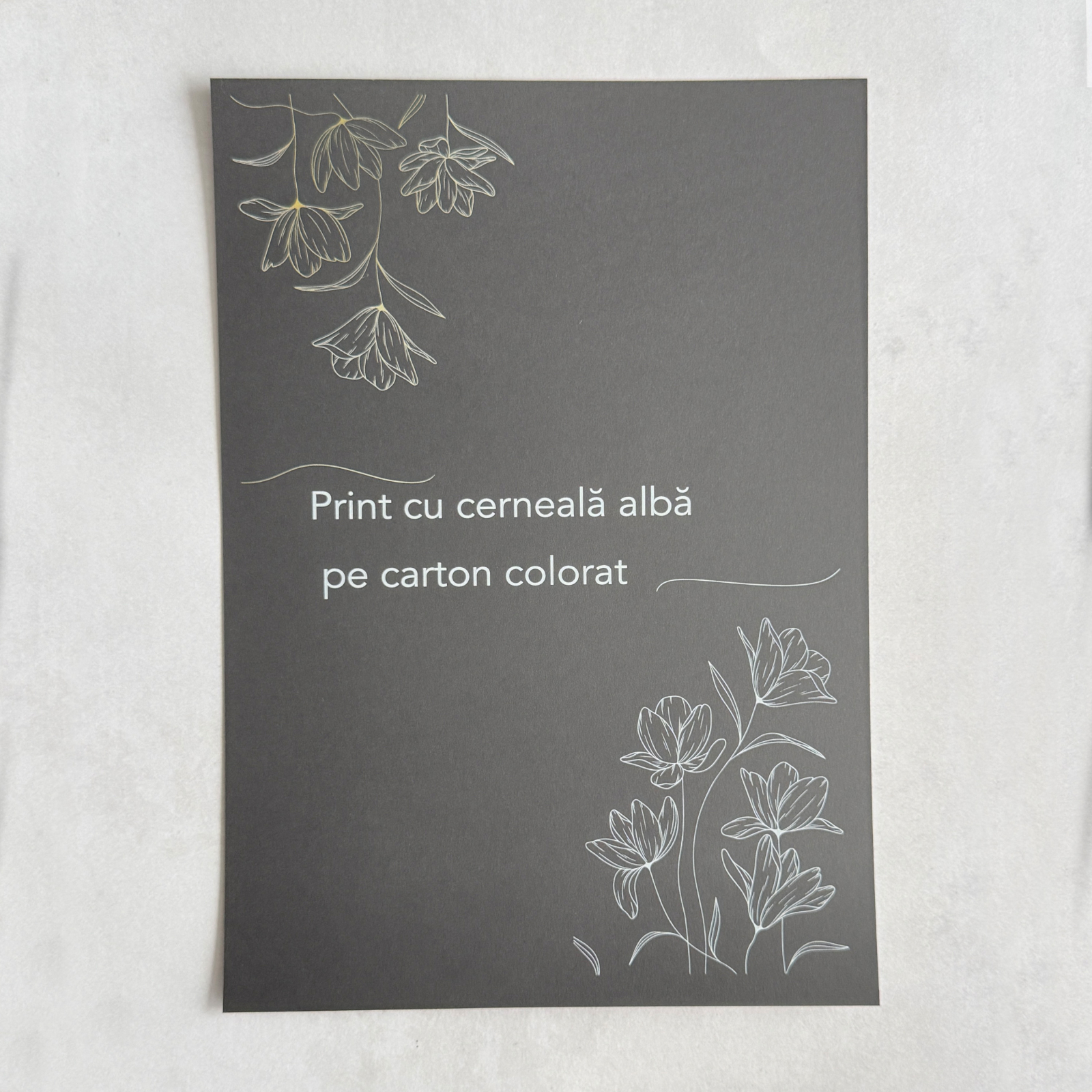 Printarea cu toner alb pe carton inchis ofera o diversitate de aplicatii, facandu-l potrivit pentru o varietate de proiecte. Tehnologia de tiparire toner alb este conceputa sa ofere o acuratete exceptionala si o aderenta perfecta pe suprafete variate. Serviciile noastre de printare alb profesional sunt disponibile in format A4, asigurand flexibilitatea necesara pentru diferite utilizari, de la prezentari personale pana la materiale promotionale pentru afaceri mici. Cu un design atent si precizie in executie, fiecare proiect beneficiaza de un aspect profesional si elegant.